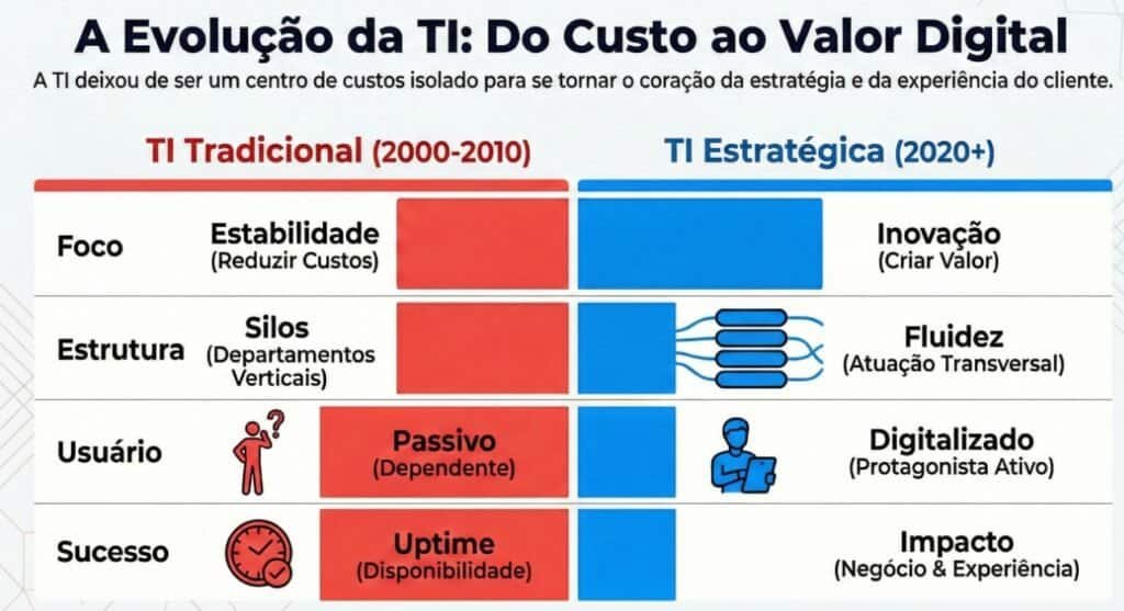 A TI evoluiu do custo ao valor digital, com foco em impacto, plataformas, experiência do usuário e confiança em IA e nuvem.