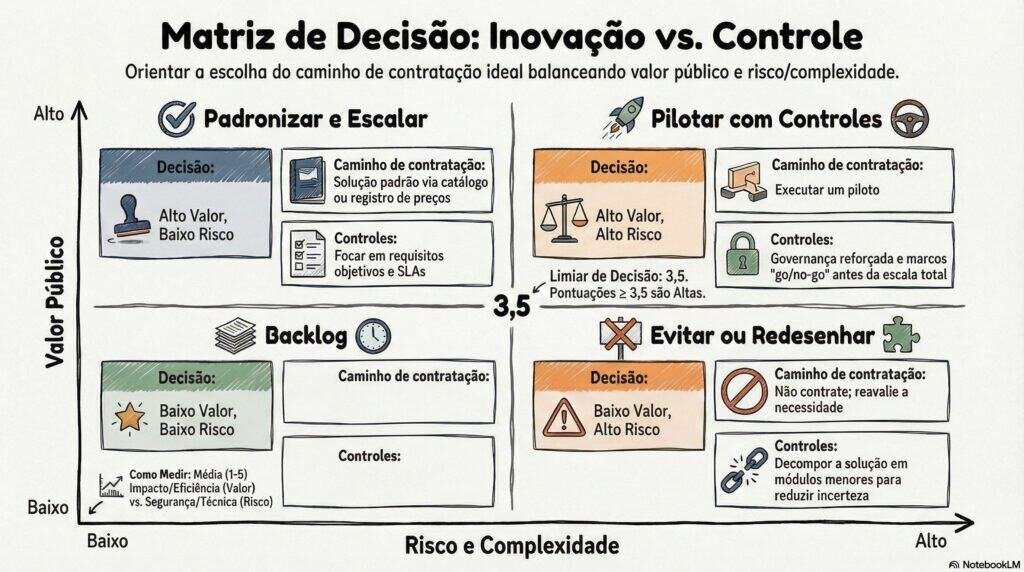 Onde a inovação pulsa com mais força é no quadrante de Alto Valor e Alto Risco. É o terreno das tecnologias emergentes, como a Inteligência Artificial generativa e o Blockchain. Nestes casos, o modelo tradicional de contratação costuma falhar por ser rígido demais. A abordagem ideal é a execução de pilotos sob uma governança reforçada.
